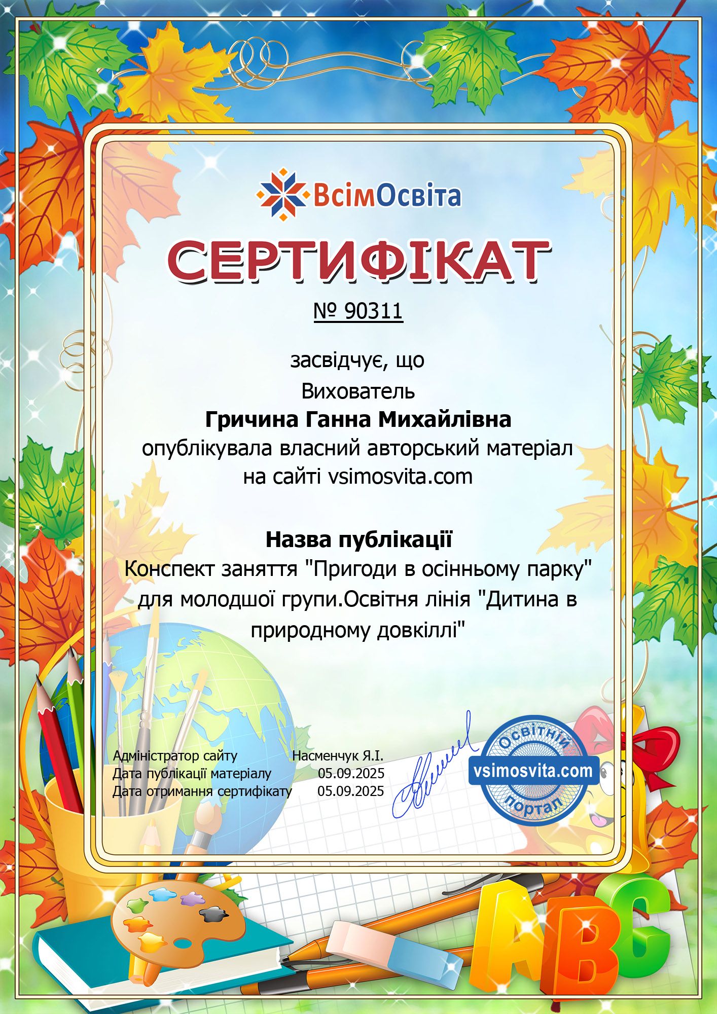 Конспект заняття "Пригоди в осінньому парку" для молодшої групи.Освітня лінія "Дитина в природному довкіллі"