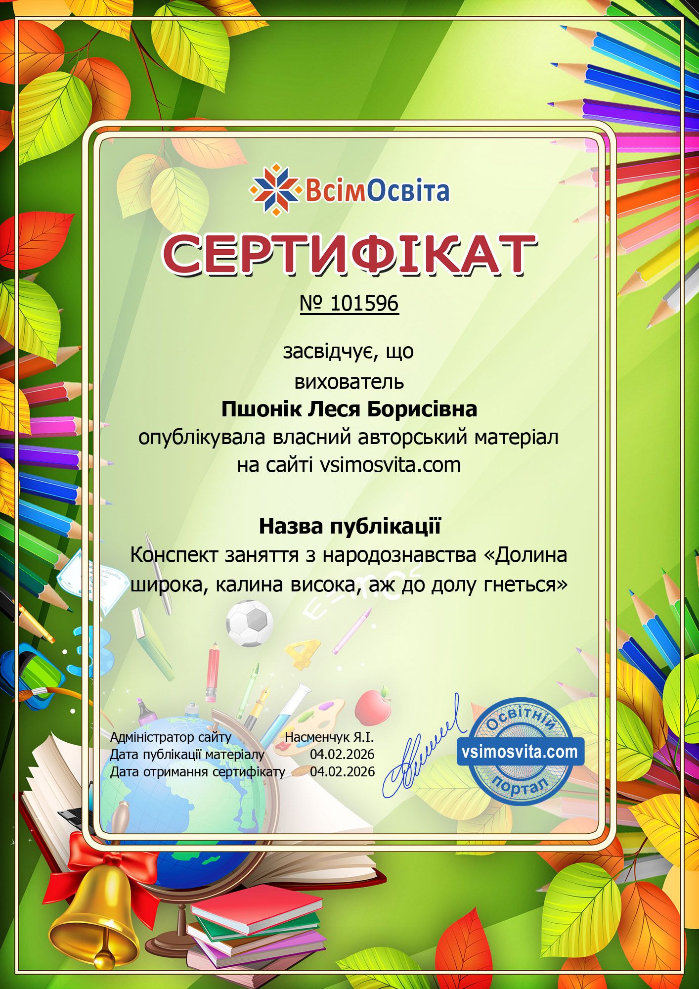 Конспект заняття з народознавства «Долина широка, калина висока, аж до долу гнеться»