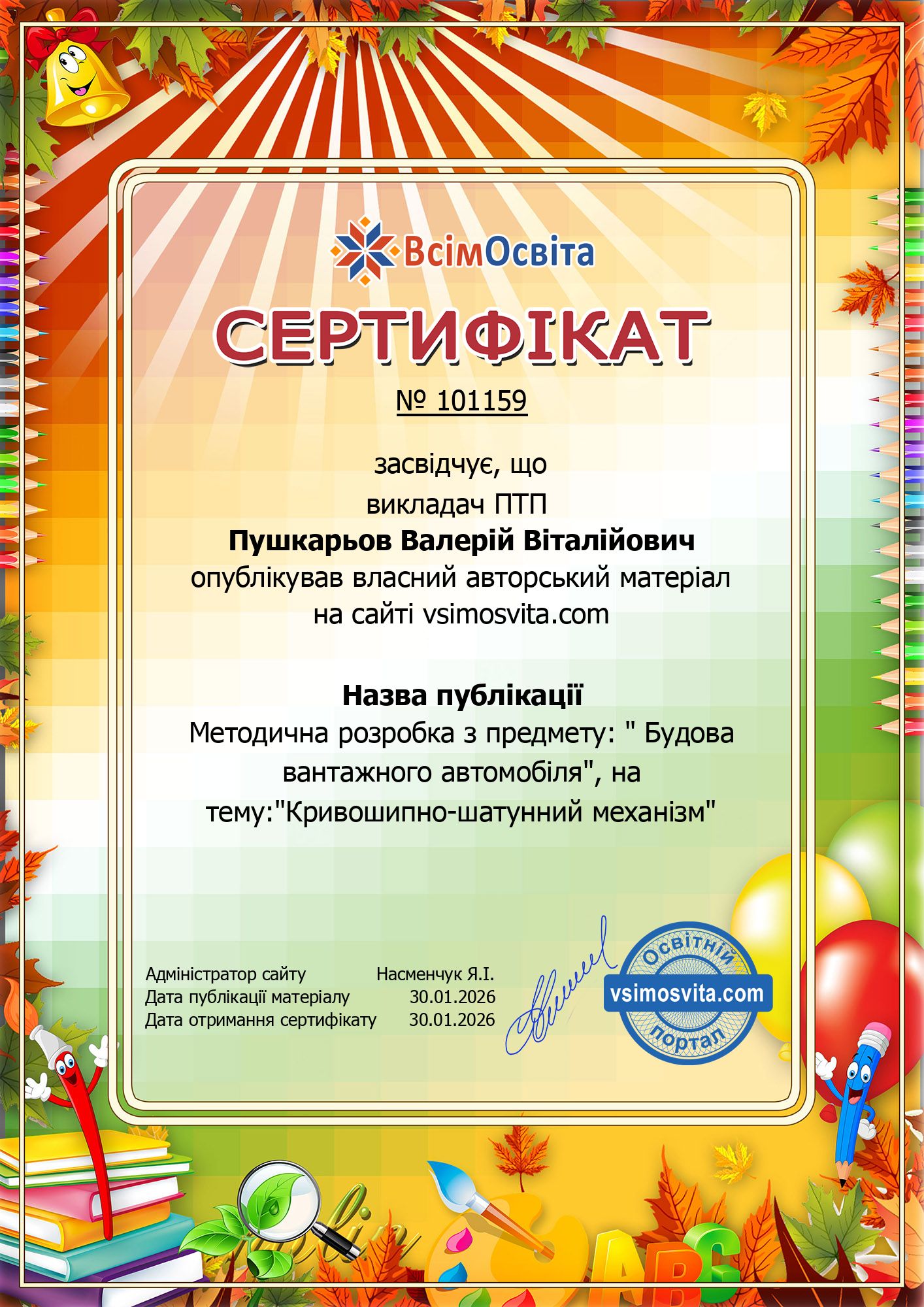 Методична розробка з предмету: " Будова вантажного автомобіля", на тему:"Кривошипно-шатунний механізм"